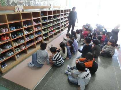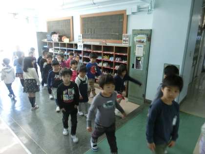 教室を出て、校内の他の場所へ移動する際は、1年生と言えども私語は厳禁です。そのお約束をしっかり守って、昇降口で学習をしていたみんなは、見事な態度でしたよ。