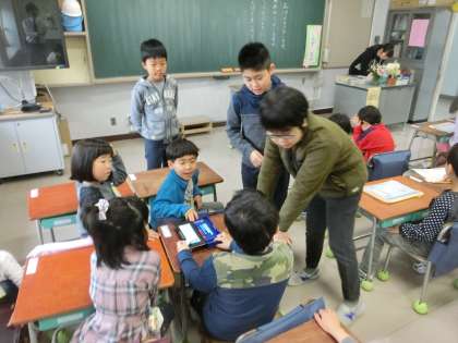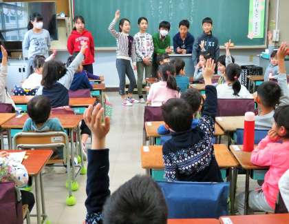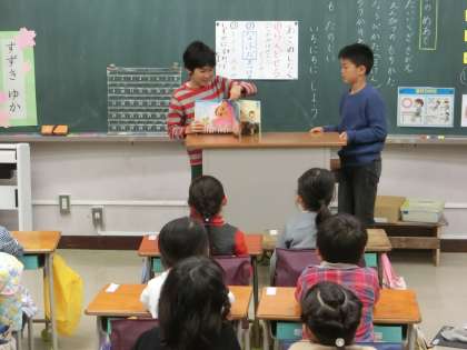 1年生のお手伝いをしてくれている6年生が、始業前の子どもたちを和ませてくれています。本の読み聞かせ、クイズ、しりとりなど工夫した演出で、寒さを忘れさせるホカホカムードが漂います。お兄さん、お姉さんのことが大好きになりそうです。