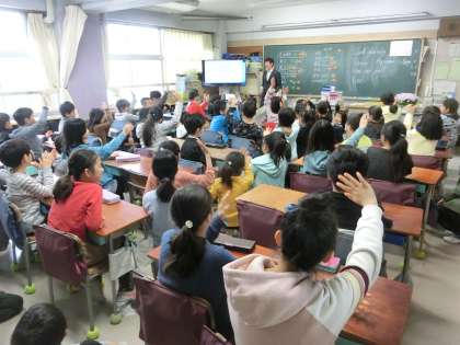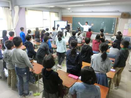 朝のモジュール枠(15分間)を活用し、5年生が外国語(ホニックスや歌)に親しんでいます。担任の先生が率先してジェスチャーを実践している場面もありました。言語に不慣れな部分があったとしても、身振り手振りを駆使しながら、思いを伝えていくことも有効な手段です。