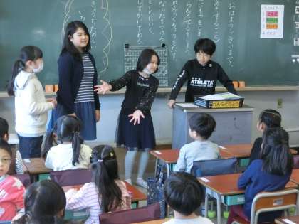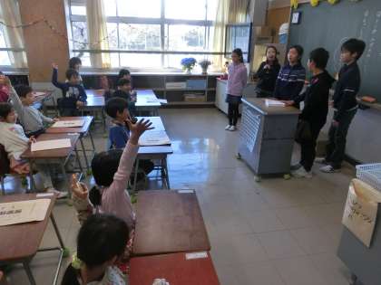 今朝も1年生の教室は和みの空間。6年生が伝言ゲーム、なぞなぞ等、みんなを楽しませるために一生懸命です。だいぶリラックスしてきましたね。
