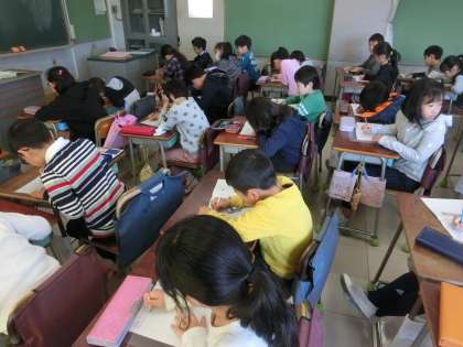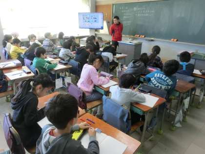 4年生の算数は「大きな数」の学習です。今日はその初回。まずは、黒板に先生が示した課題をしっかりとノートに書き写す作業から、授業がスタートしました。物音ひとつしない静寂な空気、一人ひとりの集中度がこちらにまで伝わって来ました。