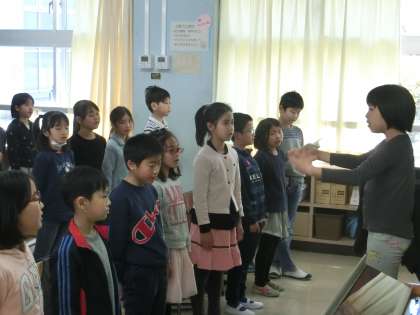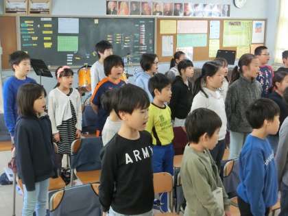 心地よい「すてきな友達」や「校歌」を歌っている真っ最中でした。指揮役を子どもたちが、意欲的に担っています。