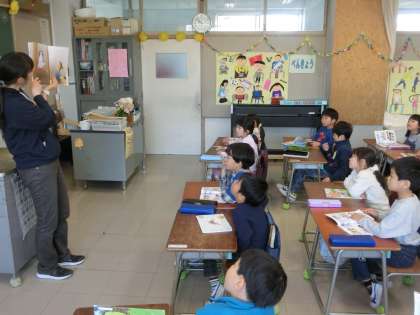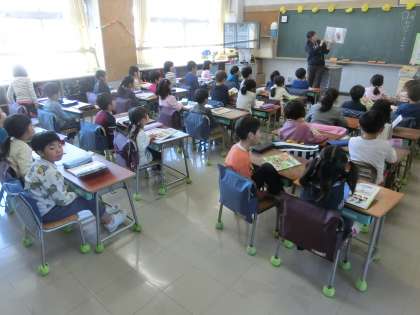 1年3組では、先生が本を片手に読み聞かせをしています。みんなの視線が集中、そして気持ちも集中。お話の世界にどっぷりとひたっていました。