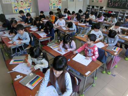 4月の1年生は、鉛筆の持ち方から始まり、文字を記す以前に線をなぞる活動を行います。2組さんが、プリントを使った運筆練習に取り組んでいました。