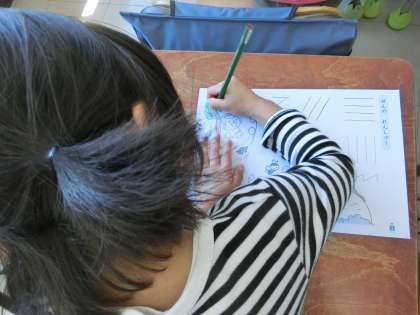 お友達が書いた様子を見て、「わー、上手!!」と自然発生的に認め合う様子も見られました。そういう気持ちも、大切にしましょうね。
