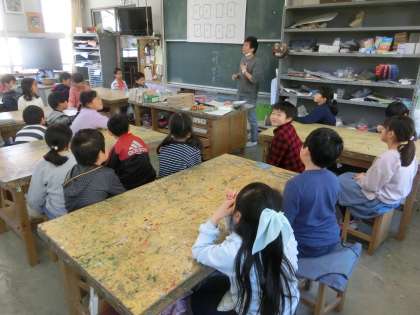 初回は図工専科の先生との出会いを果たしました。黒板にすらすら描かれていく動物のイラストから、先生の好きな動物を当てています。「やっぱり図工の先生は違うなぁ」とリスペクトが芽生えてくれたら言うことなしです。
