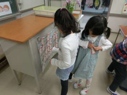 今週最初のうちは、6年生の手を借りながら、朝の準備を進めていた1年生が、わずか数日のうちに大変身を遂げているではないですか! 荷解き、提出物を出す、ランドセルをロッカーに収納、名札着用といった一連の行程をを自力でこなす子が増えています。「もう自分で出来るよ!」と自信満々の声も聞こえて来ました。頼もしい!
