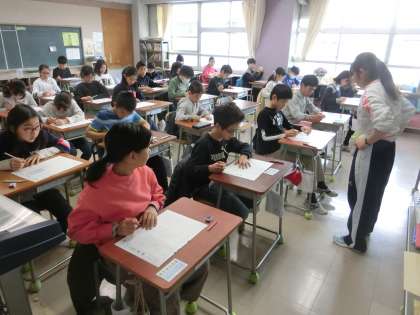 8時45分には国語の調査開始となります。その直前の6年生です。落ち着いた空気が流れています。