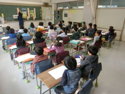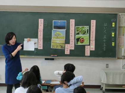 教科日本語の学習で、俳句に親しむ2年生です。五七五のリズムを感じ取りながら、著名な作品を味わっているのです。