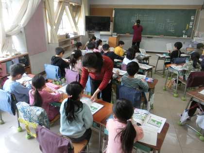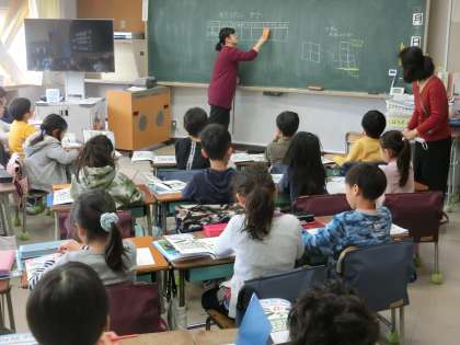 低学年算数の授業では、TTと呼ばれる教員2名体制による指導も行われます。より個に応じた支援が出来るよう、複数の目で子どもたちを見守り、学力向上の一助としていきます。