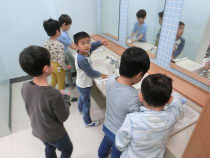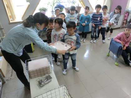 手洗いを済ませ、静かに座って待ちます。うっかり口を開いてしまうお友達に、「シー」のポーズをして教えてあげている子もいました。