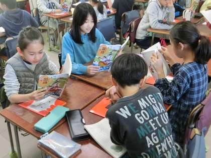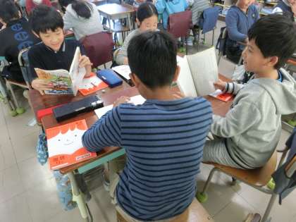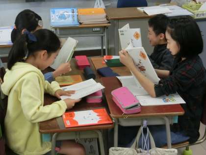 初めて出会う教科書の文章、それは内容は勿論のこと、漢字の読み方や言い回し等の謎がいっぱいです。その文章をグループで、つかえたり、間違ったりするまで、一人の子が読み続けるという耐久レース?!に、5年生が挑戦していました。