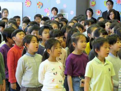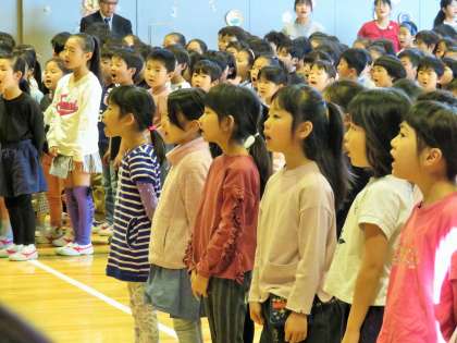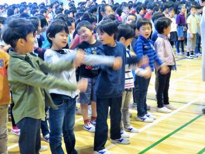 歌詞の中にある「すてきな友達と この手をつなぐのさ」のように、友達と手をつなぎながら、微笑みをかわしながら歌いました。1年生を迎える会が楽しみです!