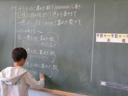 単元「大きな数」を学習しているのは4年生です。「百億」の表記ともなれば、1の後ろに0がたくさん登場します。それを正確に出来るようになることが目標の授業です。