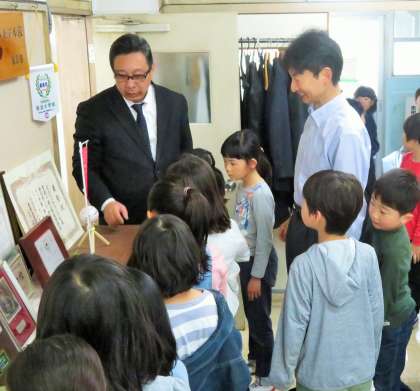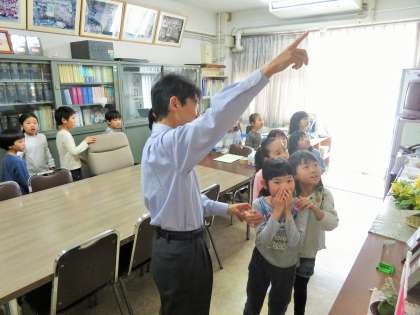 今日は2年生が、1年生を連れての「学校探検」に向けて校舎内を巡り予習しました。来週には、お兄さん、お姉さんとなり、校長室、事務室、保健室、図書室などを案内します。特に、校長室の中は興味津々のようでした!