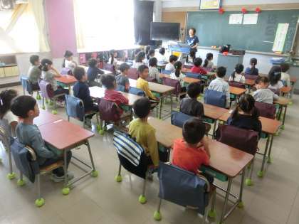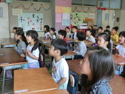 元気に歌う校歌が、1年生の教室から廊下にまで聞こえて来ます。活気ある歌声に誘われ、入室して聞かせてもらいました。もう、すっかり板についている印象でした。