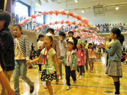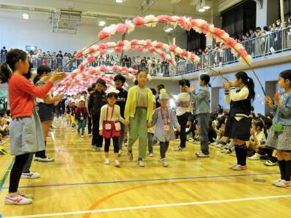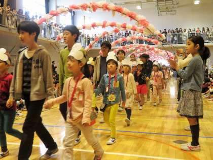 今日は1年生を迎える会です。まずは1年生と6年生が手をつないでの入場です。1年生は上級生の人の多さに、少し緊張した面持ちでした。