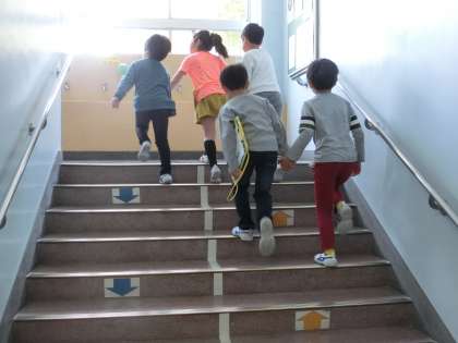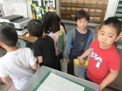 仲睦まじく手をつないだ2年生と1年生が、校内たんけんへと出発しました。普段はなかなか入れないお部屋も解放されているスペシャルデーです。校長室、職員室、事務室など、子どもたちは興味津々。