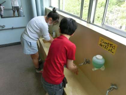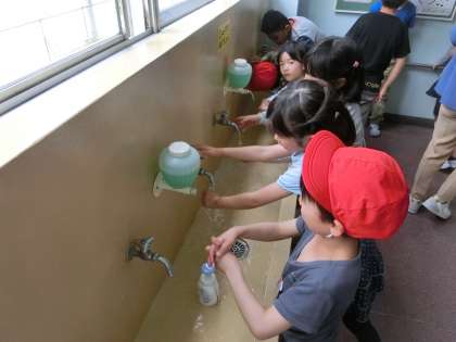 中休み終了直後の手洗い場には、遊び(画像の1年生)、ウサギのお世話(画像の5年生)で汚れた手を洗う子が集まっています。