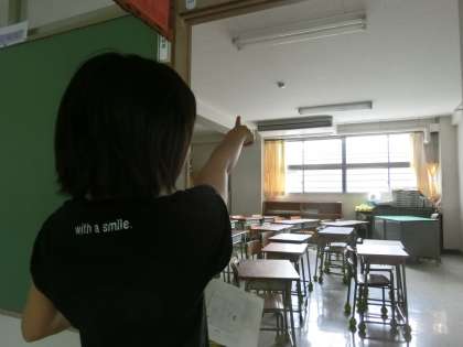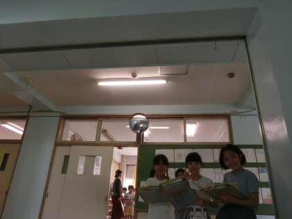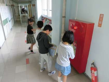 4年生は社会科学習で、校内の消防設備調べを行っています。消火器、熱感知器、防火シャッター等がある場所を見付け、学習カードに記入していました。