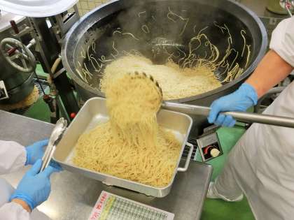 スパゲッティも、大きな釜で3回に分けて茹でています。
