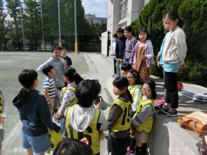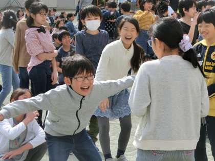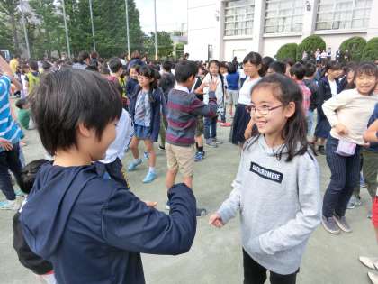 5人の先生方の好きなスポーツと食べ物について出題されました。サッカーや野球は比較的順調に進んだものの、子どもたちにとって意外に難しかったのが「スノーボード」。横乗り系を脱し、なわとびやダンスのようなジェスチャーまでとびだしていました。また、「揚げパン」が出題されると、もはやお手上げで、迷ジェスチャー続出です。特に6年生は爆笑に次ぐ爆笑、一番盛り上がっている印象でしたよ。