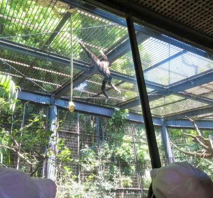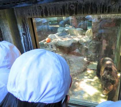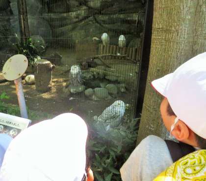 フクロウとは、思わず目が合ってしまいました。クマの大きさ、テナガザルがうんていで遊んでいるような姿にも歓声が上がっていました。
