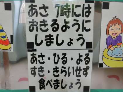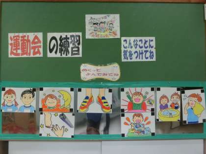 運動会練習が本格化する頃となり、保健室前の掲示物が一新しています。