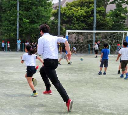松丘小学校の休み時間は、子どもと教師が一緒に遊ぶ「共遊び」を奨励しています。遊びを通して、授業中だけでは分からない、一人ひとりのよいところに気付いたり、ほんの小さな変化や情報も、この共遊びの中から得られればと思っています。