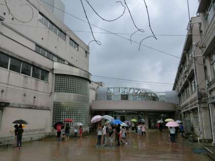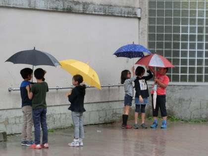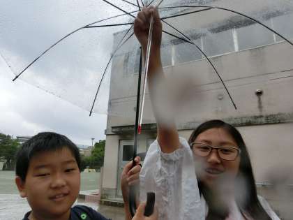4年生の理科では、一日の気温変化を調べ、天気による違いがあるのかを探る活動があります。本日は雨の日について調べる絶好のチャンス! 犬走りに出てきて測定を行っていました。8時30分、19度という結果に終わった子が多かったようです。