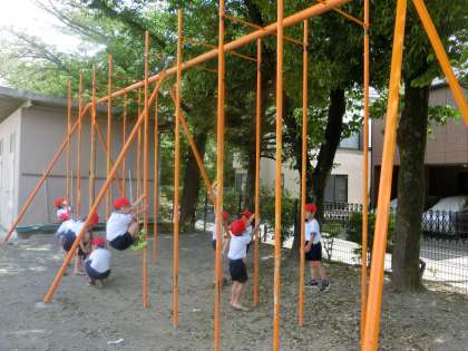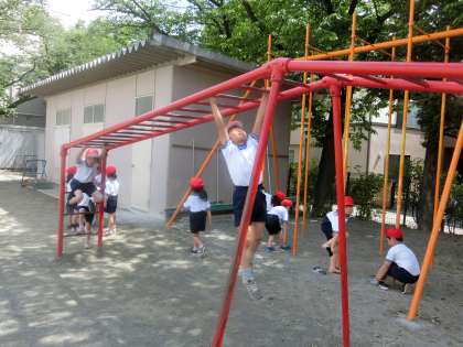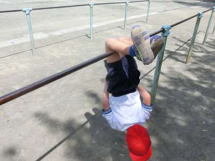 1年生が雲梯、のぼり棒、ジャングルジム、鉄棒に取り組んでいます。