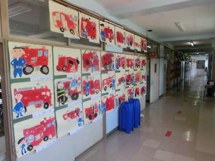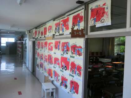 おはようございます。2階の廊下を巡視していると、真っ赤に染まっています。先日の消防写生会の絵が完成し、続々と掲示されているのです。低学年全員が仕上げた絵は、ざっと300点以上。それが並ぶ様は、なかなか壮観です。