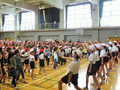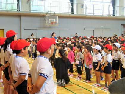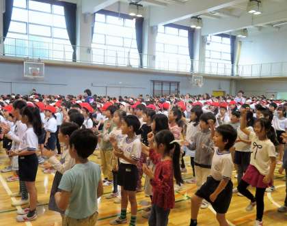 赤組からのスタートでしたが、出だしからとても大きな声が出ていました。続いて歌う白組は、さらに大きな声で歌い、最後に両者が歌うところでは、体育館が割れんばかりの大きな声が交錯していました。歌を聴いて子どもたちのものすごい気合いが感じられました。
