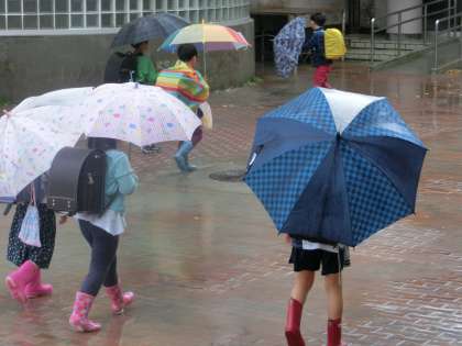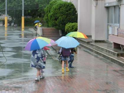 1年生がのんびりと帰って行きます。まだ傘の花は咲いているものの、小降りになっており、風の危険も感じられません。
