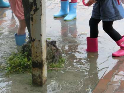 足首までつかる深い水たまりを見付けて、驚きの声をあげている子もいました。