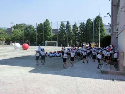 午後になると、体育館が校庭に日かげを作ってくれます。5校時が体育となっていた2年生は、時々日かげに入ってクールダウンする時間を取り入れながら、大玉ころがしの練習を進めていきました。