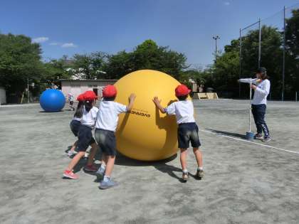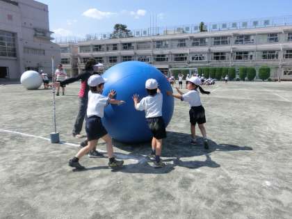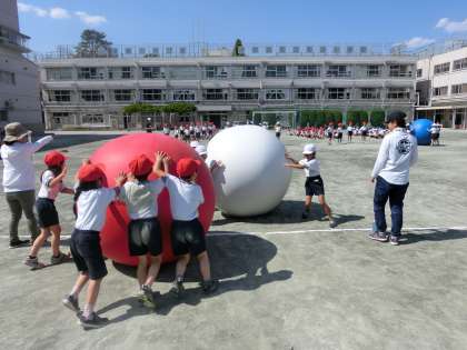 中・小規模校では、運動会の大玉は2色が基本です。しかし、そこは大規模校の松丘、スケールが違います。青と黄色の大玉も大活躍して、2年生の団体競技や全校競技を盛り上げます。ダイナミックな運動会にご期待くださいね。
