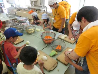 ちょっぴり危なげな1年生たちですが、包丁を手にして、野菜を切る作業に取り組んでいます。パパたちがアシストしてくださるから、きっとうまくいくね。