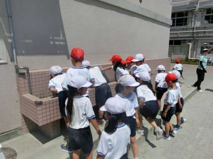 校庭練習のブレイクタイム、水飲み場は一番の人気スポットと化しています。