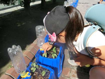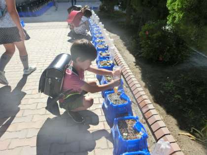 双葉が微笑んでいる鉢がたくさん見られました。それを目にした子どもたちもニッコリです。