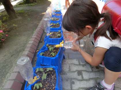登校して来るなり1年生が、口にしています。耳を傾けてみると「あさがお、あさがお」「水をあげなくちゃ!」「もうこんなに大きくなってる!」「まだお日様が当たっていません」・・・、あさがおに対する意識の高さが溢れているではありませんか。