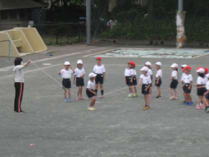 まずは、縄の動きに合わせて出発するタイミングを覚えることが先決です。縄くぐりを目標にして頑張っていますが、早くも跳ぶめあてまでをも達成している子がいて驚きました。