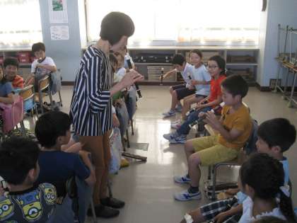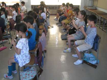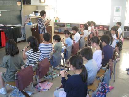 中学年の仲間入りとともに、リコーダー学習に取り組んでいる3年生です。左手によるソラシドを完璧にしようと、毎回の授業で頑張っています。今朝はだいぶ自信をもちつつある音出しのウォーミングアップから、活動がスタートしていました。先生が出した音を真似して一人で吹くときは、ちょっぴり緊張しつつも、みんな楽しげでしたね。