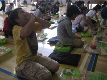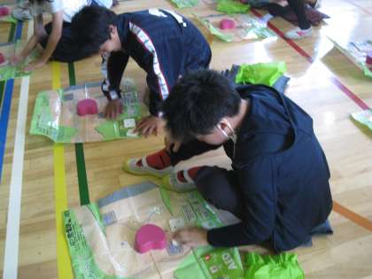 いざというとき、自分たちが行動すべき必要性を痛感した6年生が、いよいよ実践的な活動を行うプログラムです。呼び掛け反応の確認、周囲へのヘルプ依頼・・・一つ一つの手順を実際に声に出したり、手を動かしたりしながら体験しています。
