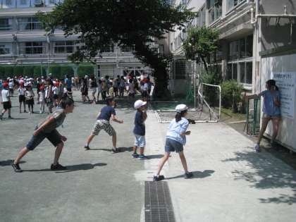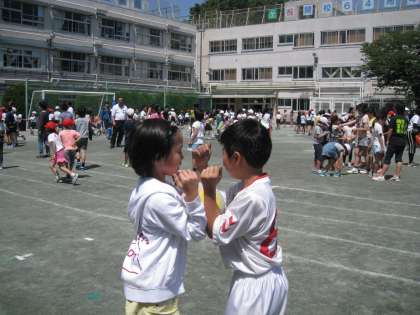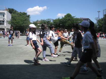 たわわり集会の時間です。校庭と体育館で、班ごとに遊んでいます。高学年のリーダーたちが工夫を凝らした遊びが展開し、スマイルいっぱいのすてきな光景です。