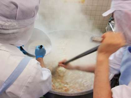 フルーツ白玉は、すべての食材を釜に入れて混ぜて作ります。