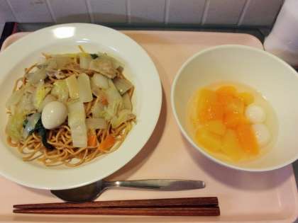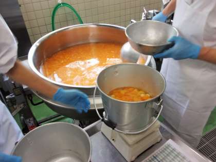 みかんと黄桃と白玉がどのクラスにも均等に入るように調理員さんが丁寧に配缶してくれました。