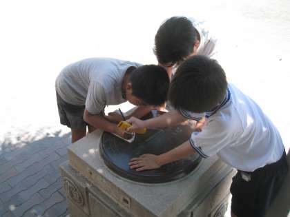 5年生3人が日時計を取り囲んで、何やら調べている様子です。理科の学習でしょうか。でも、そうは思えないのです。黙って動向を見守り続けたものの、結局私には皆目見当がつかず、本人たちに直接質問してしまいました。すると、高低差がある土地について勉強していて、松丘小の標高を調べているのだとか。よく見ると、そこには標高が刻まれていました。日時計に標高が記されていると知っていたことに、驚くやら感心するやら。えっ、誰でも知っていることでしたか?