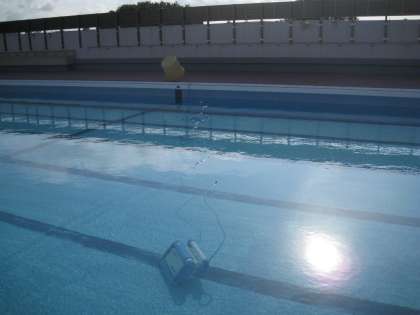 清掃を済ませたプールには、きれいな水がはられています。水泳指導開始へ向け、水質管理にも余念がありません。水中を見ると、「お掃除ロボット君」が大活躍していました。