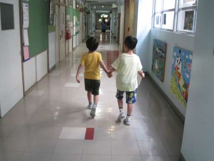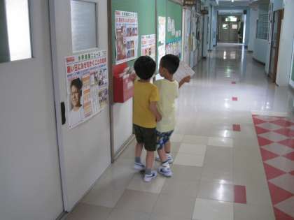 体育館へ向かおうとする私の目にとびこんできたのは、先行する1年生の二人組でした。健康カードを保健室に届けようと、仲良く手をつないで歩いていたところなのです。微笑ましすぎ!